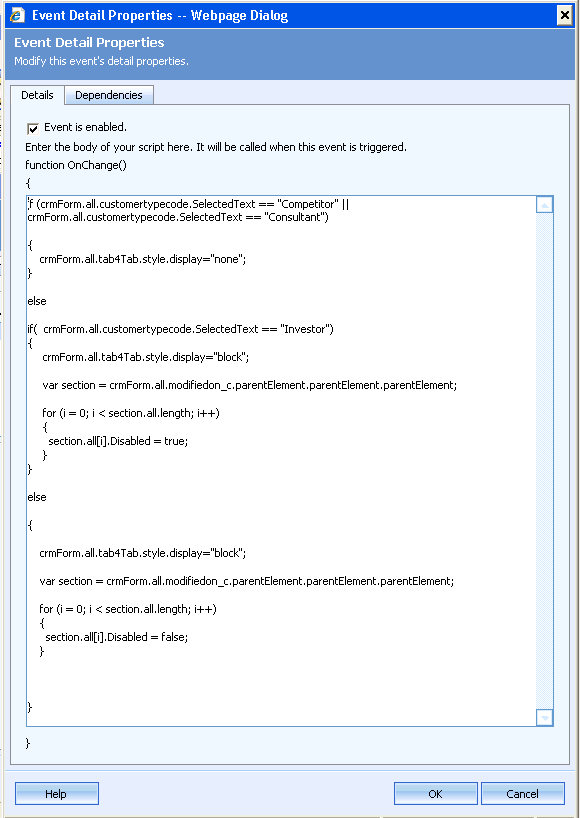 Cut and Paste the following code into your "Events" text area, ensuring that "Event is enabled" is checked and save.