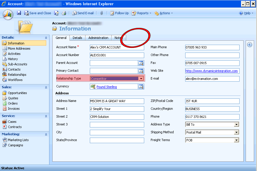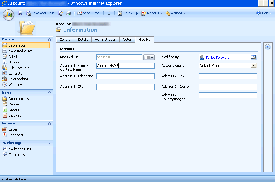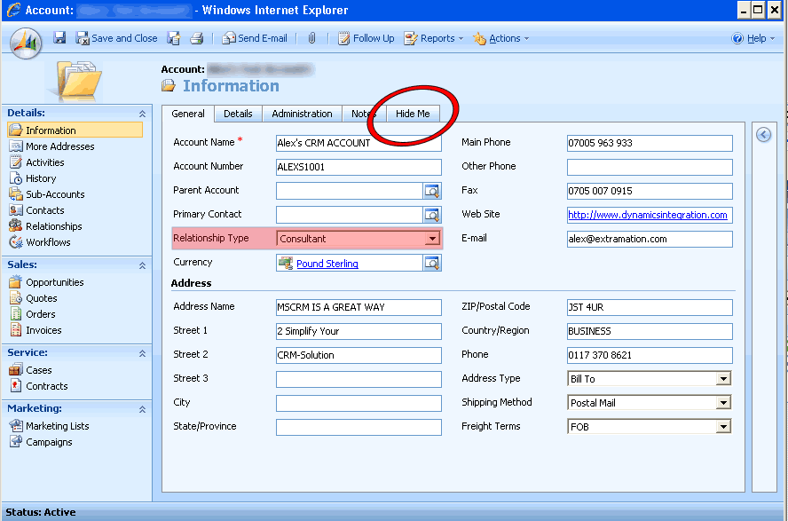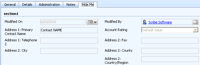 The screenshot below depicts the CRM Account entity. The tab labelled "Hide Me" circled in red